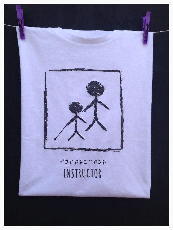 Braille awareness t-shirt is a tactile image of a child using a white cane with an adult guiding them .