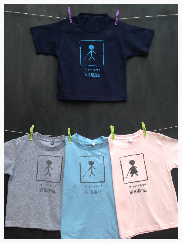 Braille awareness t-shirt with tactile image of a child using a white cane.
